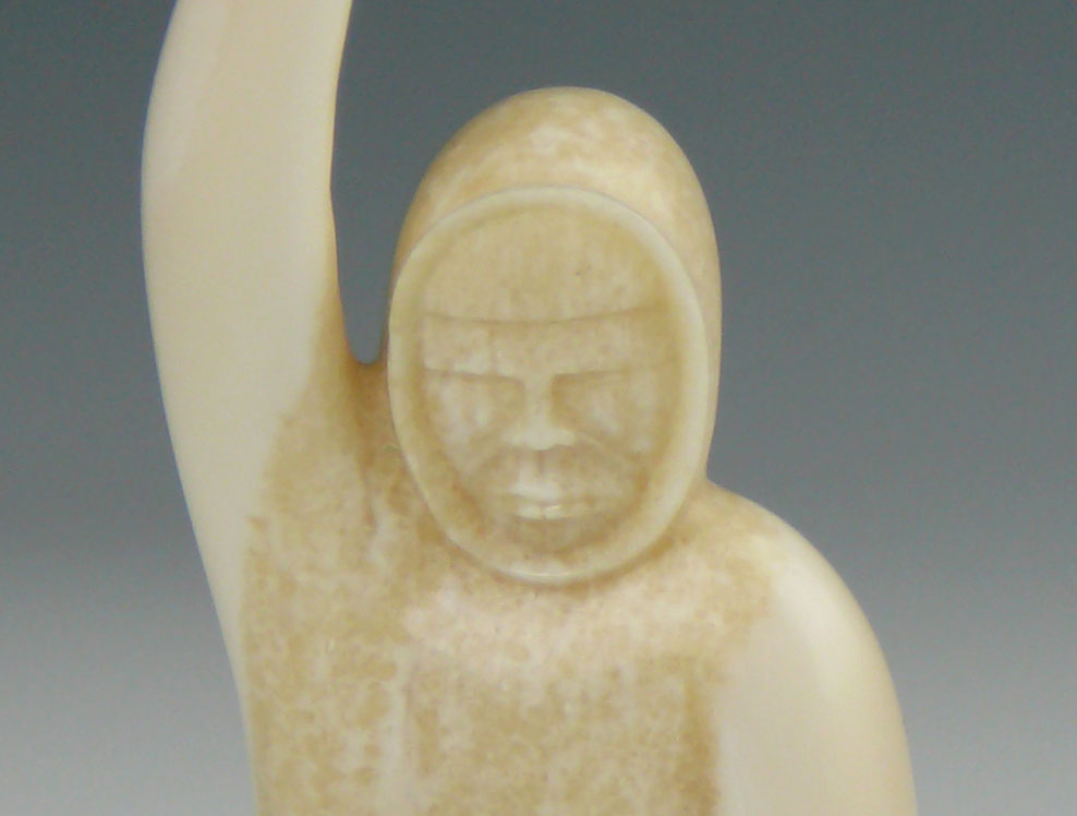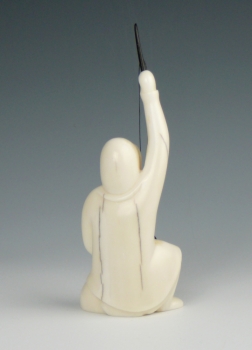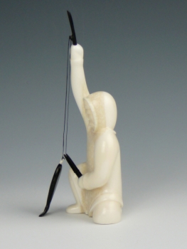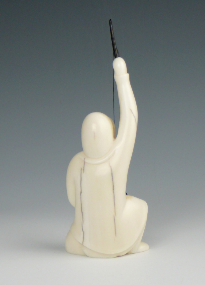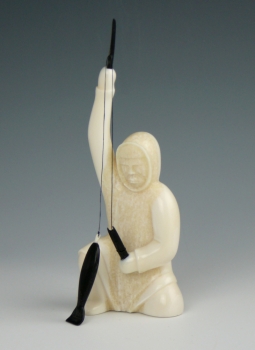 Once again, with his signature simple yet expressive technique, Noongwook captures the core activities of the Yupik culture. Here he depicts a fisherman who has just reeled in a catch. The fisherman is carved from a creamy piece of walrus ivory. The fish and spool are baleen.
