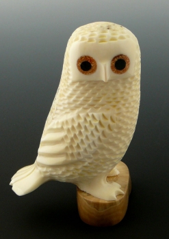 Ivory owl, Circa 1975Tommy Antoghame always used beautiful ivory in his carving. Tommy carved various animals but was always known for his owls, and from this example we can see why. The owl is large and heavy and sits on a gorgeous piece of fossilized ivory. The eyes are a combination fossil ivory and baleen inlay.